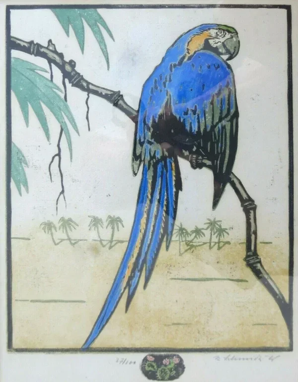 Karl Schmidt-Wolfratshausen (1891–1971 Germany) Kleurenhoutsnede 'Blauwe Ara' ~1920 Gesigneerd met potlood