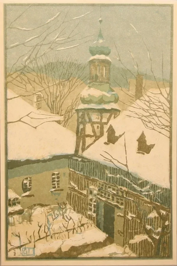 Gertrud Leschner (1879-1961) Kleurenhoutsnede 'Hof met groententuin in winter' ~1905