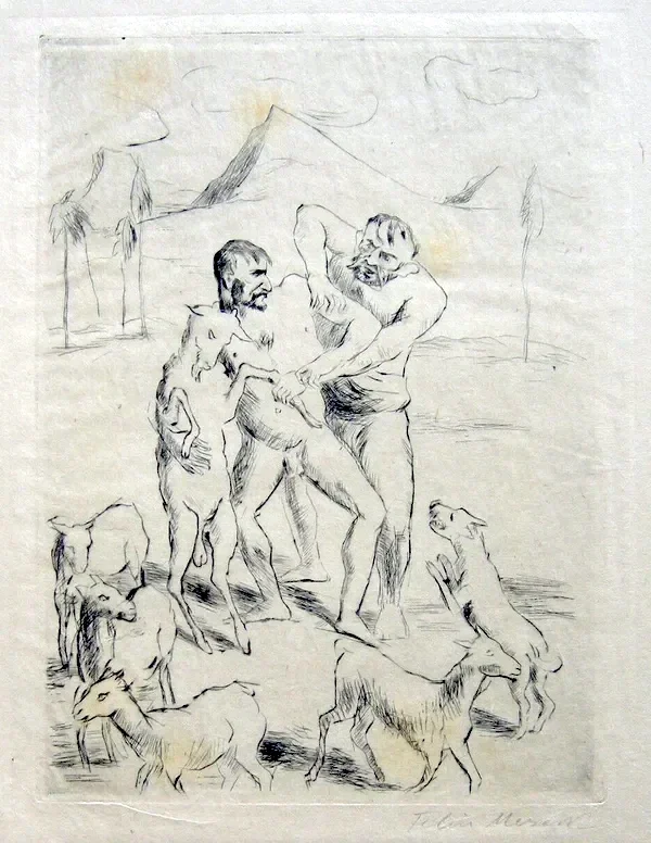Felix Meseck (Danzig 1883-1955) Ets (droge naald) 'Geiten met mannen met handgemeen' ~1920 Gesigneerd met potlood