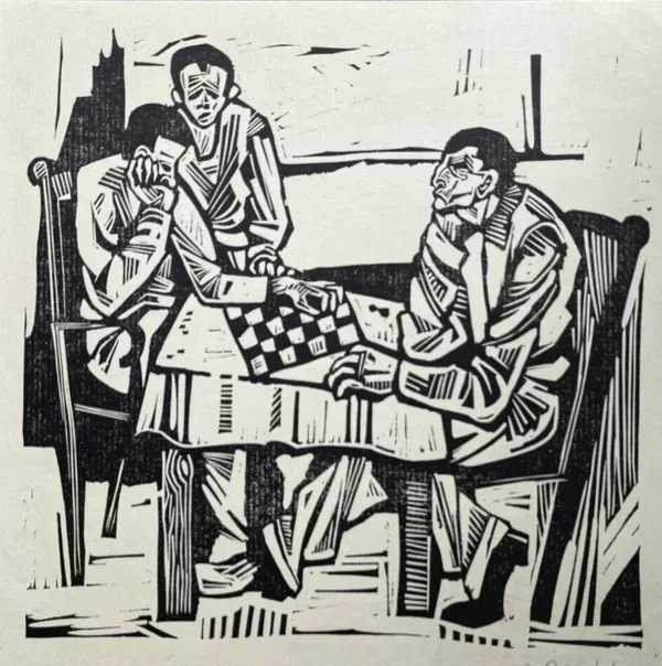 Georg Opretzka Houtsnede ‘Potje schaak’ ~1950 Gesigneerd met potlood
