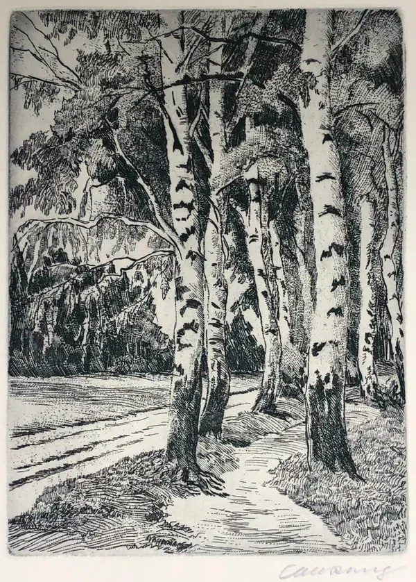 Carl Rang (1886-1965 Germany) Ets 'Pad bij berken aan akkerrand' ~1930 Gesigneerd met potlood