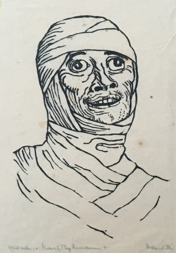Karl Thylmann (1888-1916) Houtsnede 'Kreigsverletzte 1. WK' ~1914 Gesigneerd met potlood