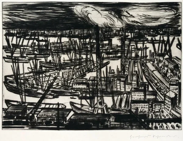 Gerhard Schrader (Germany 1907-1985) Ets 'Hafen Rotterdam' ~1940 Gesigneerd met potlood