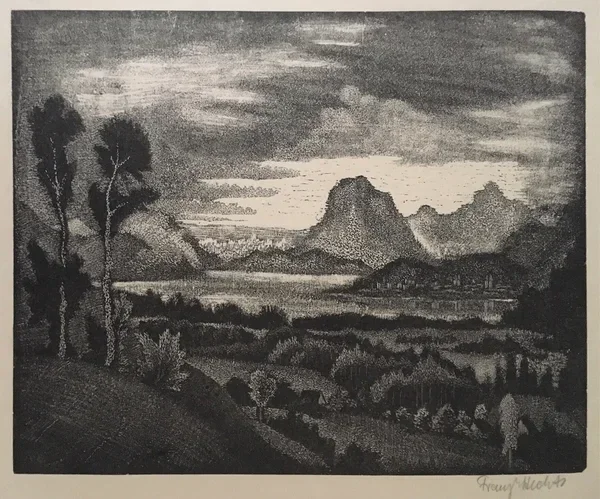 Franz Hecht (1877-1964) Houtsnede 'Blick auf Bregenz' circa 1920 Gesigneerd met potlood