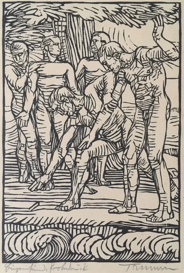 Peter Trumm (1888-1966) Houtsnede 'Atleten' circa 1920 Gesigneerd met potlood