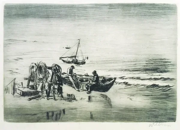 Walther Klemm (1883-1957 Karlsbad, Germany) Ets (droge naald) ʻNetboetende vissersʼ ~1910 Gesigneerd met potlood