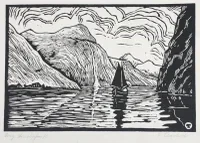 Fritz Teuchert (1909-1941) Linosnede 'Bergmeer met zeilschip’ ~1935 Gesigneerd met potlood