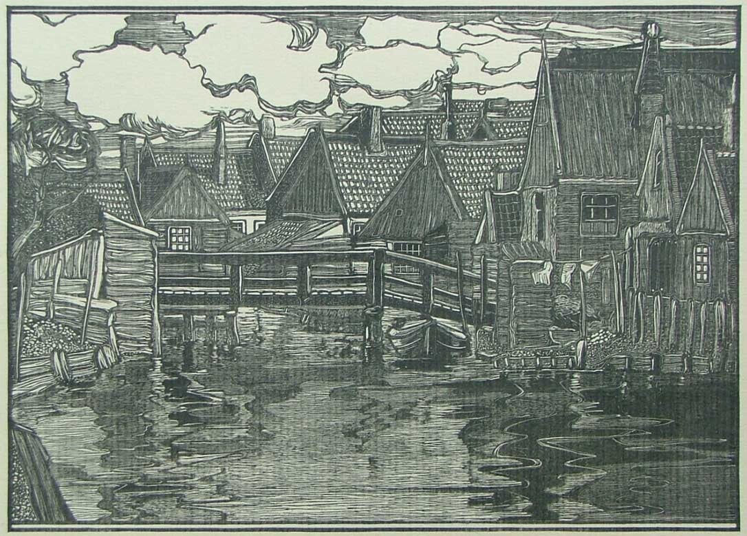 Jacobus Gerardus Veldheer (1866-1954) Houtsnede 'Visserplaats a/d Zuiderzee - Volendam' ~1898