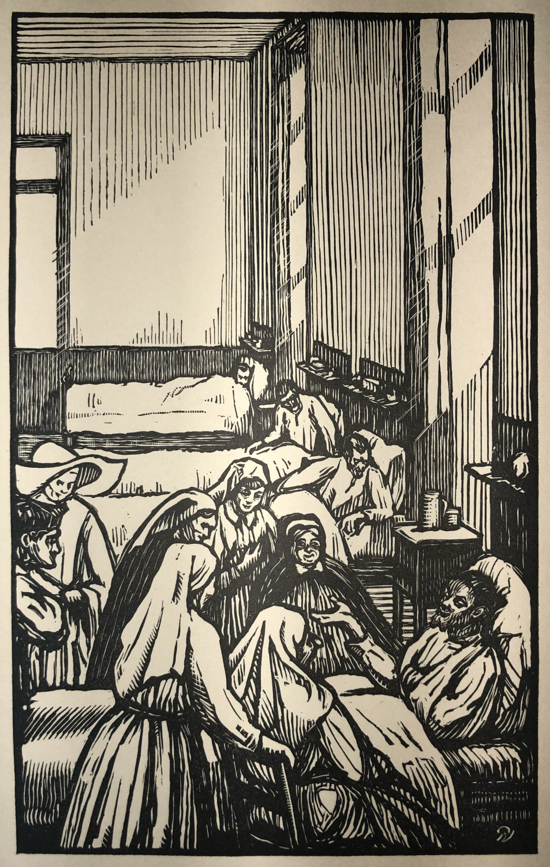Paul Maurice Vigoureux (1876-1954) Houtsnede 'Heldenverhalen in de ziekenzaal' 1935