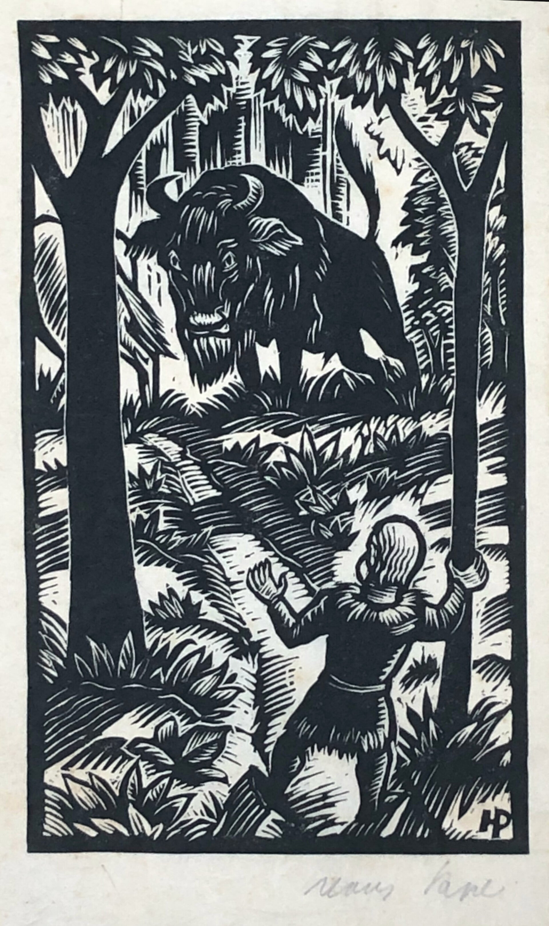 Hans Pape (1894–1970) Houtsnede “Stier in het bos” ca. 1925 Gesigneerd met potlood