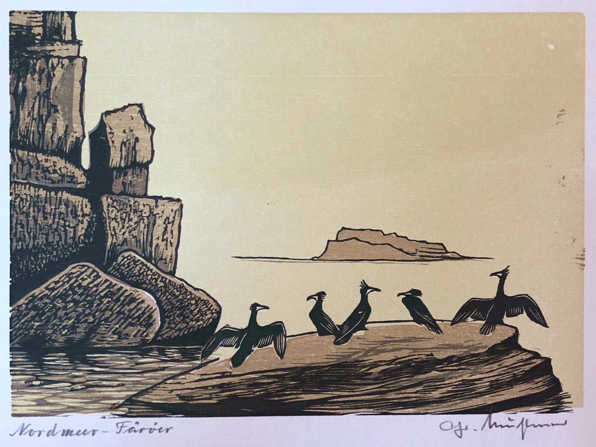 Chritian Mühlner (1916-2008) Kleurenhoutsnede 'Aalscholvers aan zee bij de Färöer Eilanden' ~1990 Gesigneerd met potlood